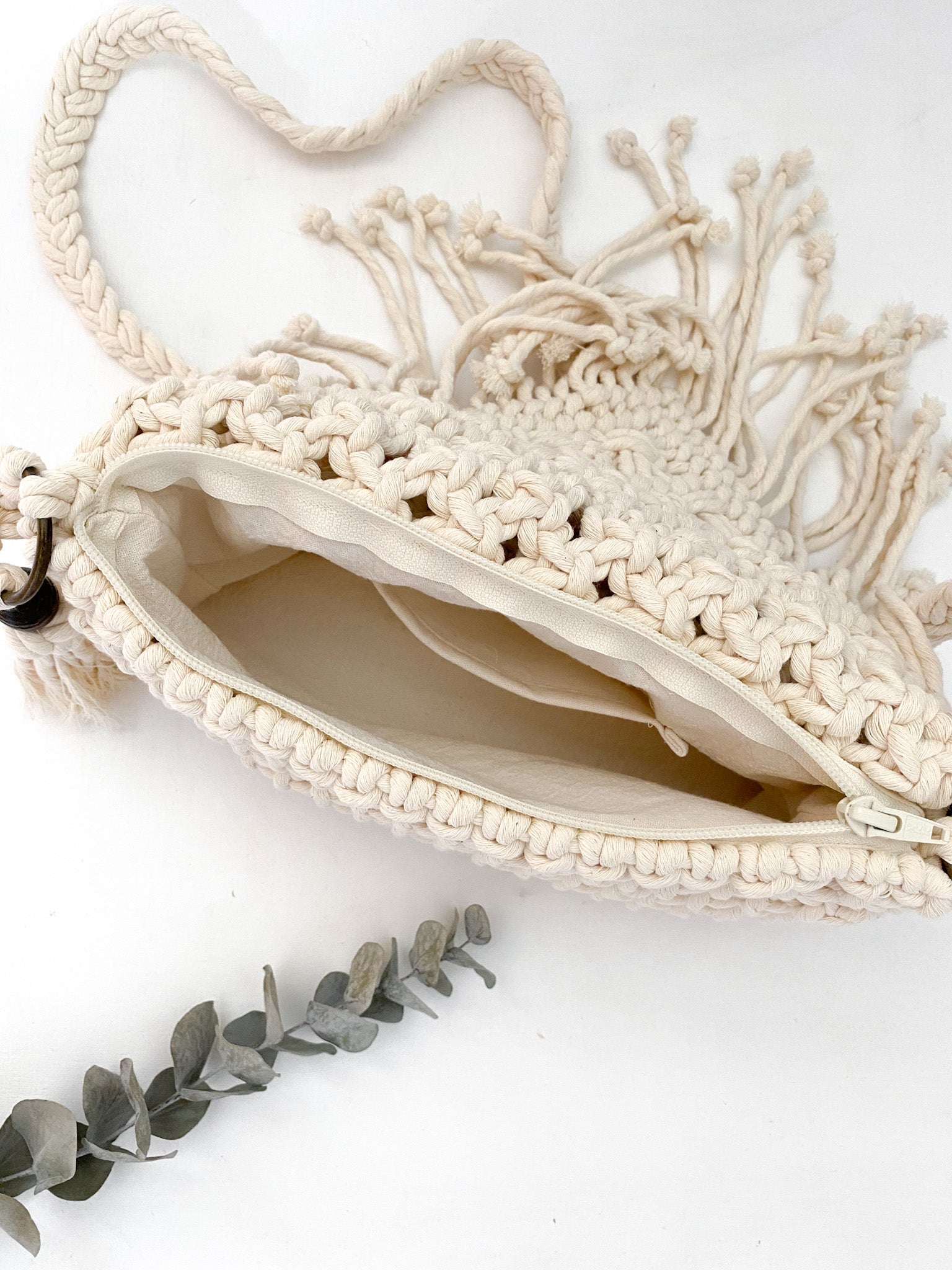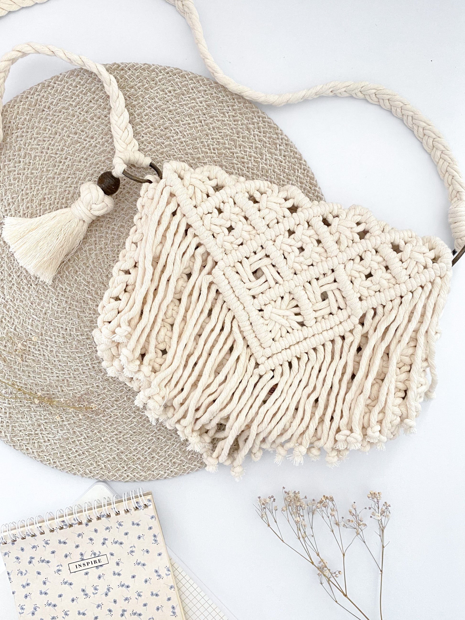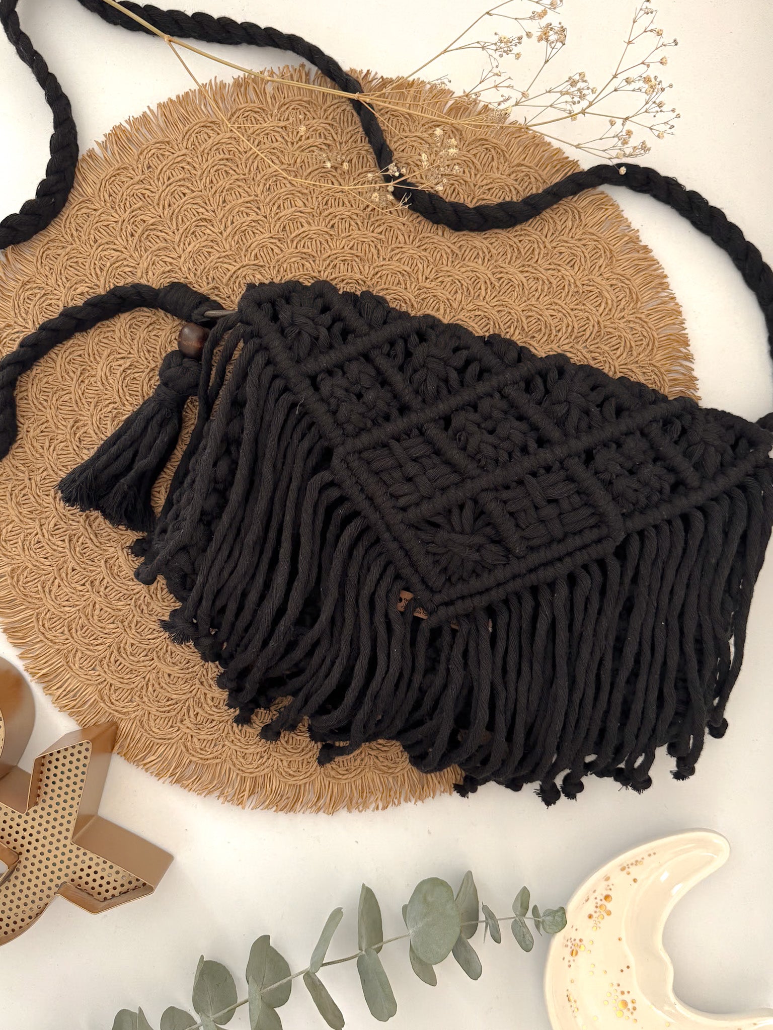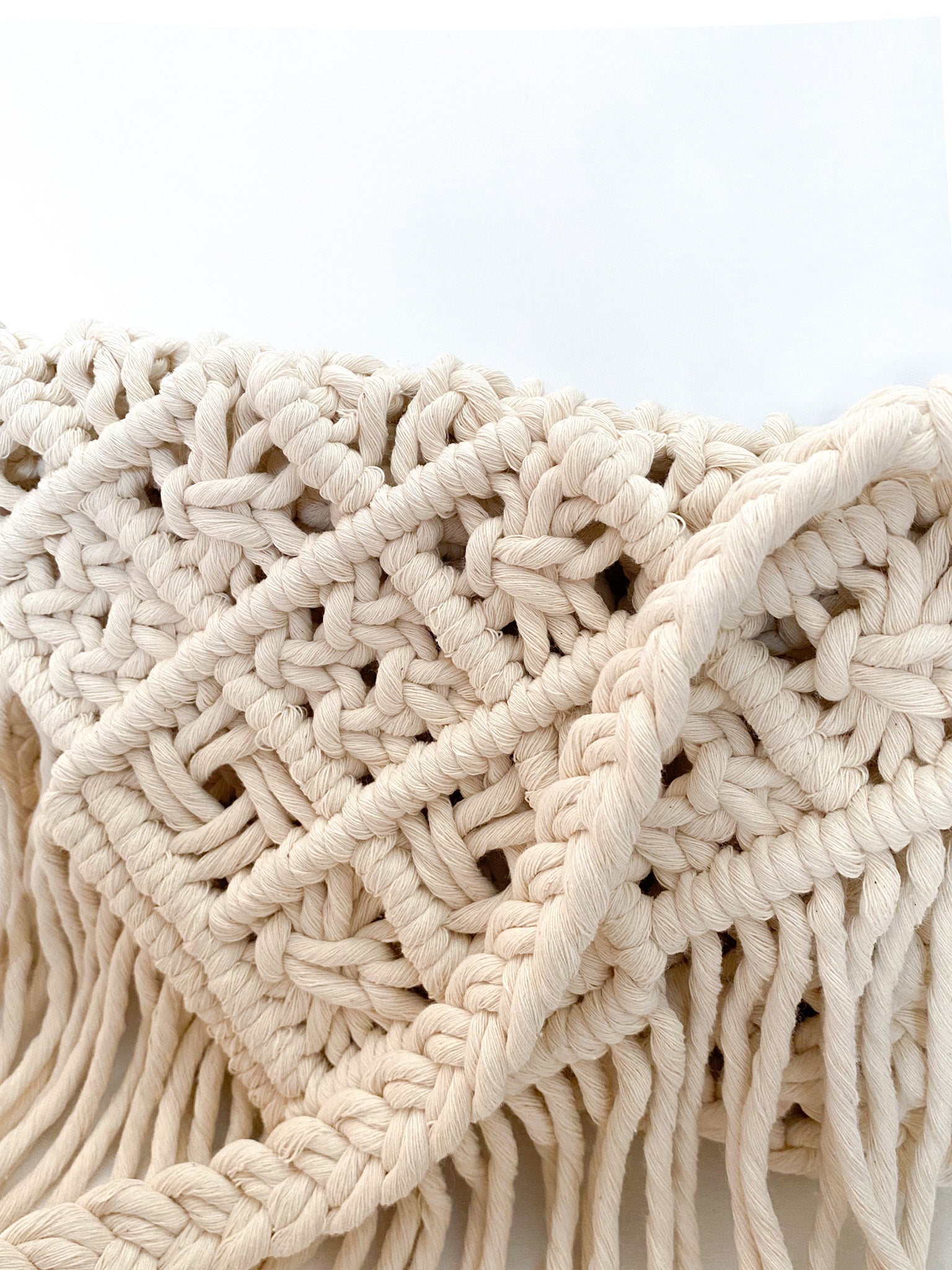 Tejida a mano con técnica de macramé, cada nudo le da un acabado único, con textura y presencia.